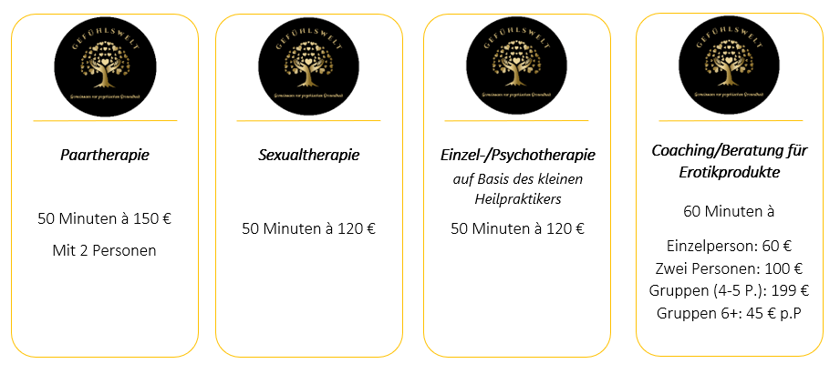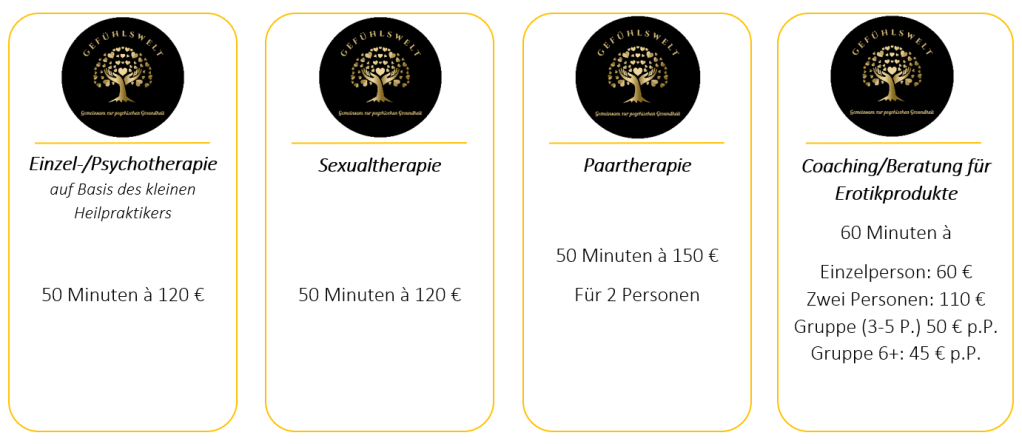 Im Folgenden finden Sie eine Übersicht meiner Leistungen und was diese beinhalten, sowie eine Listung der Preise weiter unten. Bitte nehmen Sie zur Kenntnis, dass es sich im Rahmen der Therapieformen um hohe und anerkannte Wirksamkeiten handelt, diese jedoch nicht von der gesetzlichen Krankenkasse unterstützt/finanziert werden. Dennoch gibt es private Kassen und Zusatzversicherungen, welche mitunter Kosten für Sexual- und Paartherapie oder Psychotherapie auf Grundlage des Heilpraktikers übernehmen. Bitte informieren Sie sich hierfür bei ihrer jeweiligen Zusatzversicherung/privaten Kasse vor Antritt der Therapie. Selbstzahler müssen hierbei nichts weiter beachten!